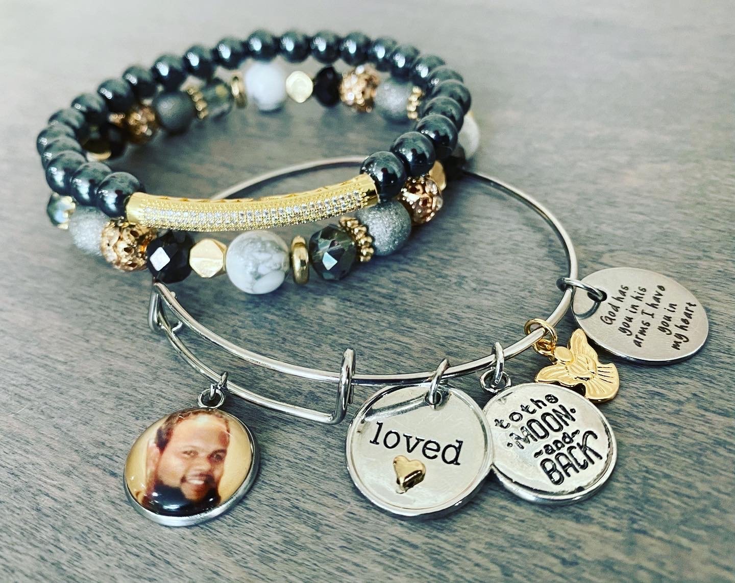 Gold and silver charms, silver adjustable bangle, cz gold barrel charm, 10mm assortment of beads, and 8mm hematite protection stones